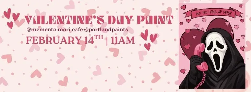 This Valentine’s Day ❤️ romance gets a little spooky. Join us at Memento Mori Café for a spooky, flirty paint session featuring a Ghostface inspiced design with a Valentine’s twist. Think iconic horror energy… but make it cute and flirty 👀💗